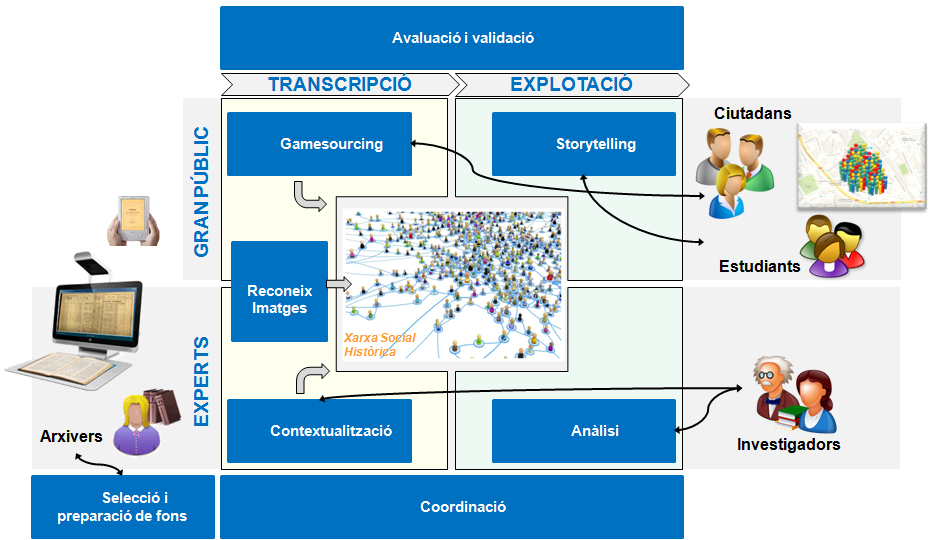 Utilitzant la visió per computador com a tecnologia facilitadora, en primer lloc s’incorporaran mecanismes que permetin la contextualització automàtica dels continguts de les fonts originals, associant la informació semànticament. En segon lloc, es vincularan per record linkage diferents fonts demogràfiques per a la construcció de les xarxes socials del passat. Finalment, s’inclourà la participació activa de la ciutadania i dels arxivers tant en l’extracció de les dades demogràfiques a través de jocs informàtics com en el disseny de noves experiències d’usuari més atractives (ex. geoprojeccions en mapes interactius). D’aquesta manera es vol facilitar el consum i divulgació del coneixement històric d’una manera gràfica i pedagògica.